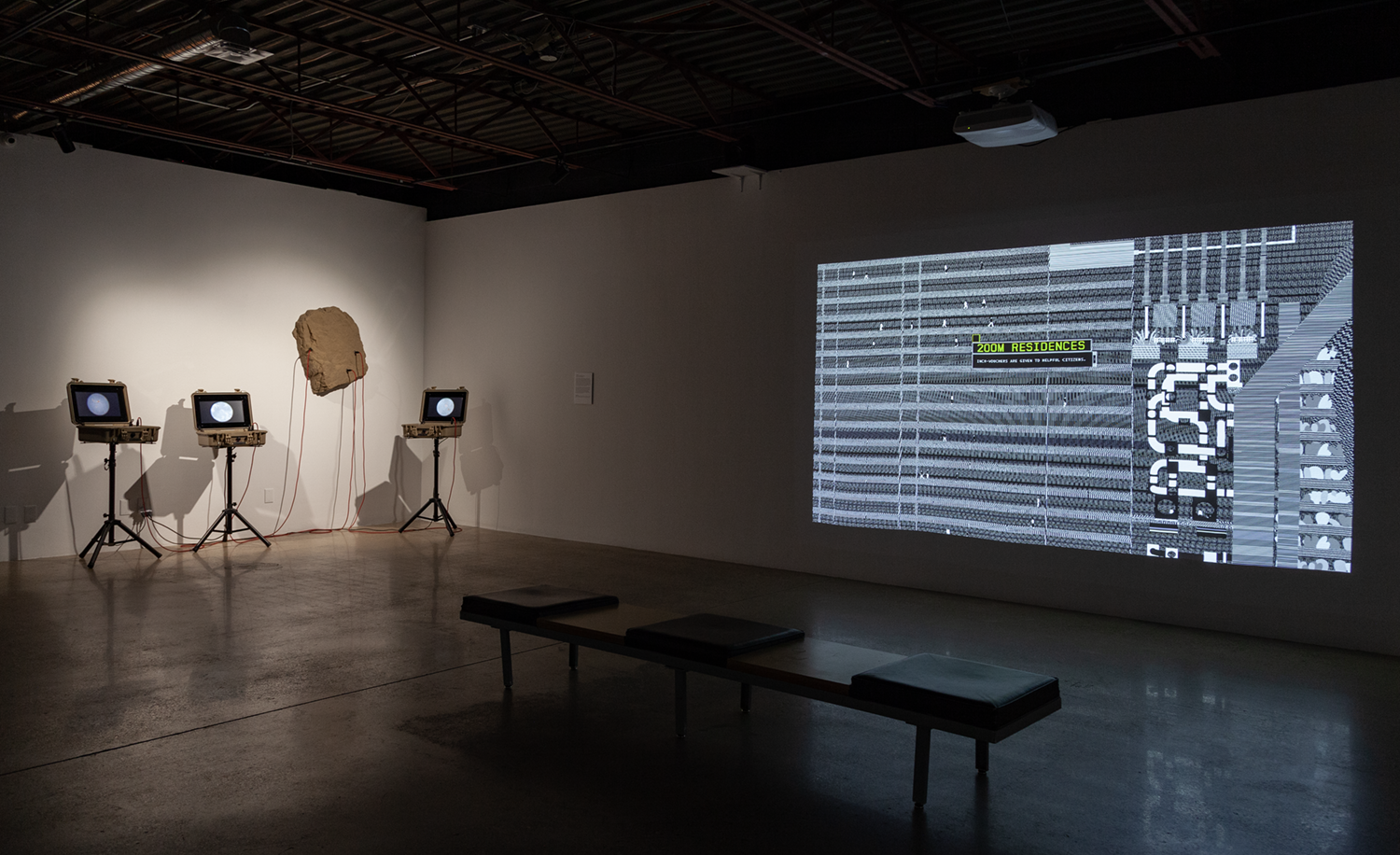 Below are photographs from a recent exhibition of ecocritical game art I curated at PAVED Arts in Saskatoon in Summer 2023 titled Object Gardens. Participating artists included Guggenheim fellow Peter Burr (USA), 2018 EQ Bank Emerging Digital Artist Award winner Anna Eyler and her partner and collaborator Nicolas Lapointe (CAD), and Venice Biennale-presenting artist Jakob Kudsk Steensen (DNK). My selection of these artists and their work was significantly influenced by my growing interests in ecocritical, historical, and postcolonial game studies and the writing of authors like Jeff VanderMeer, Donna Haraway, and Timothy Morton.