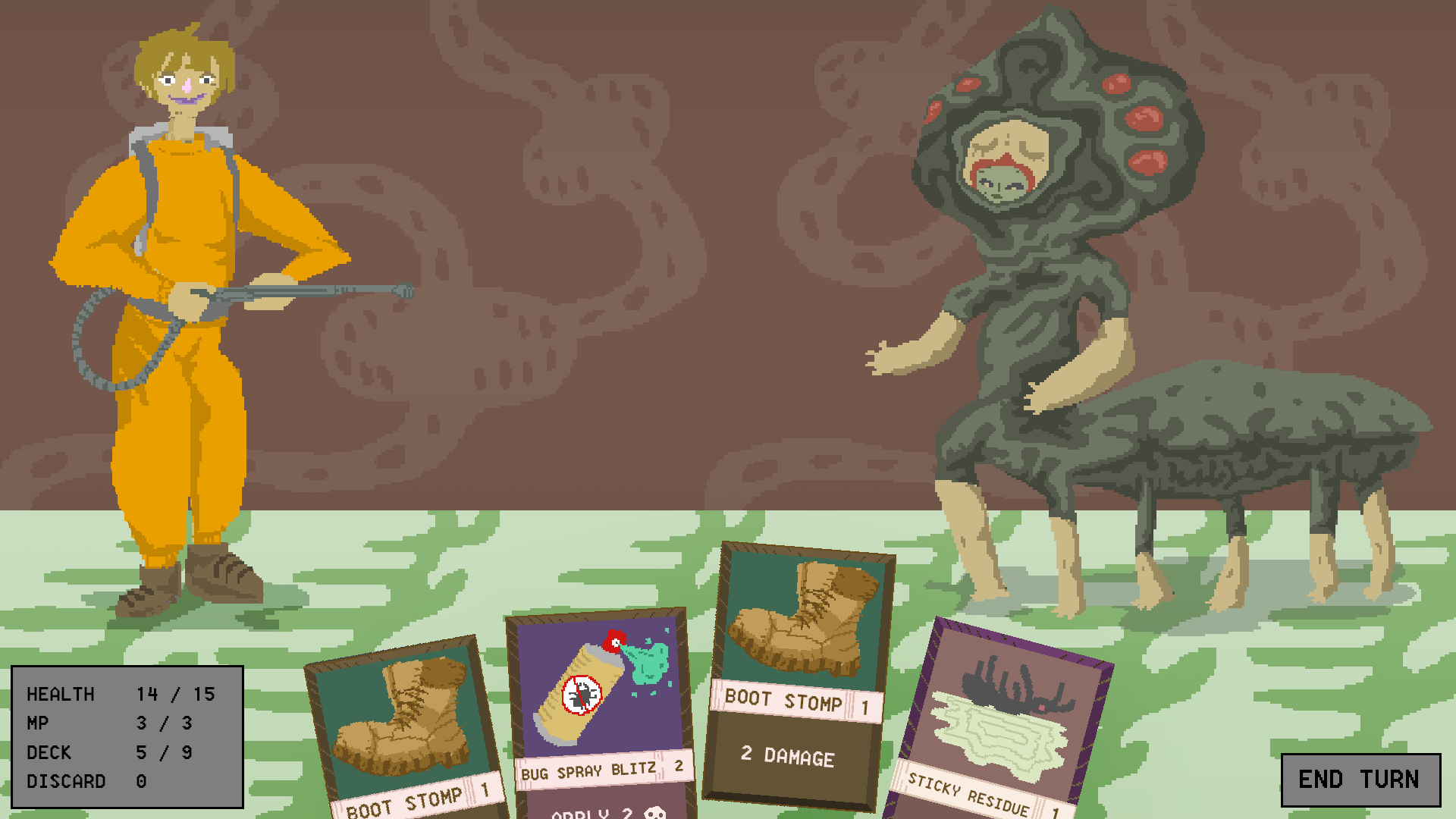 The first of my current game dev projects is a side-scrolling card battler RPG tentatively called Mold Ant Hole that I am creating using RPG Maker MV and MythAtelier’s Card Combat and SideMV’s Basic Side-Scroller plugins. The general premise of the game is that you play as an exterminator who has been hired by an elderly witch to clear out the colony of anthropomorphic ants that have occupied her basement. A lot of the character design and overall aesthetics of this game have been inspired by Canadian comic artist Michael Deforge’s Ant Colony and “Canadian Royalty” (from Lose #4).