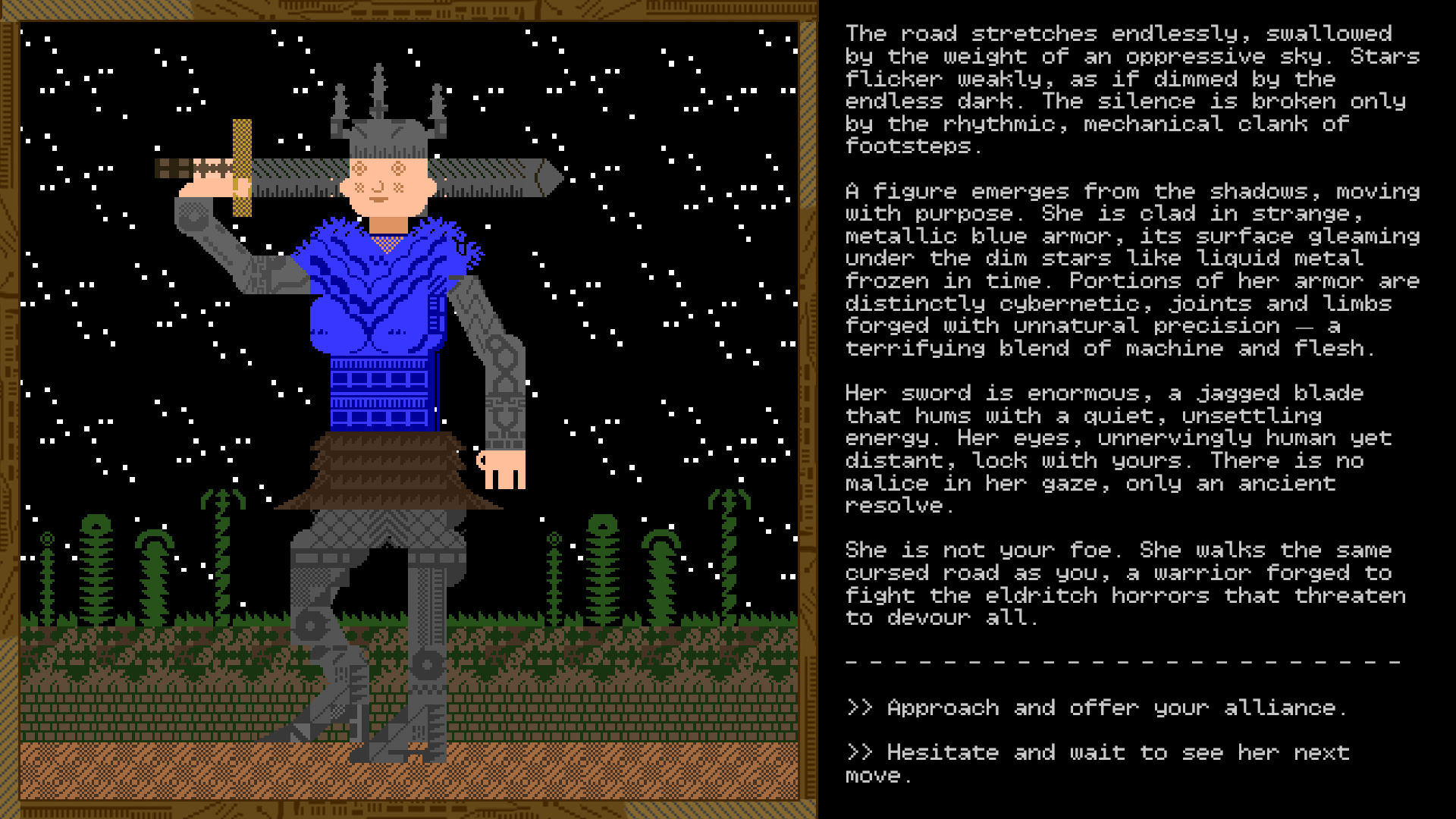 The other of my two current game dev projects is a currently untitled interactive text adventure game inspired by my love for the Fighting Fantasy series of game books. For this project, I am loosely adapting Laird Barron’s short story “Oblivion Mode” from the anthology Children of Lovecraft. To create the art for this game, I am using JP LeBreton’s PLAYSCII, which is an open source ASCII art program. The tile/character set I am using in PLAYSCII to create my images is Mrmo Tarius’s MRMOTEXT and I am using the PLAYPAL palette (what was used for the original MS-DOS version of DOOM). To develop the actual game, I am using the open-source Python-based engine, Ren’Py.